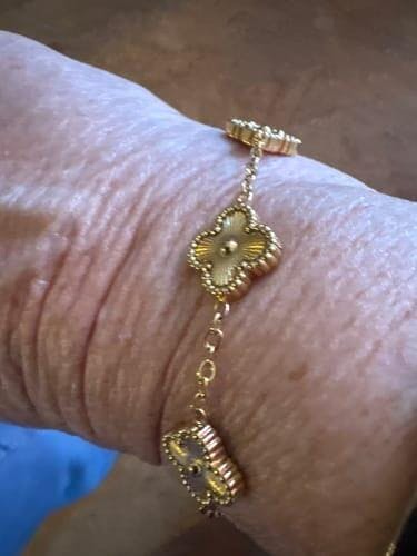 The CLOVER Bracelet | Gold is an elegant and sophisticated accessory with a charming floral design that exudes both luxury and playfulness. The design with detailed flowers and a gold chain makes it a versatile choice for any occasion. Made from ethically made stainless steel with 18k gold, this bracelet is both durable and stylish.